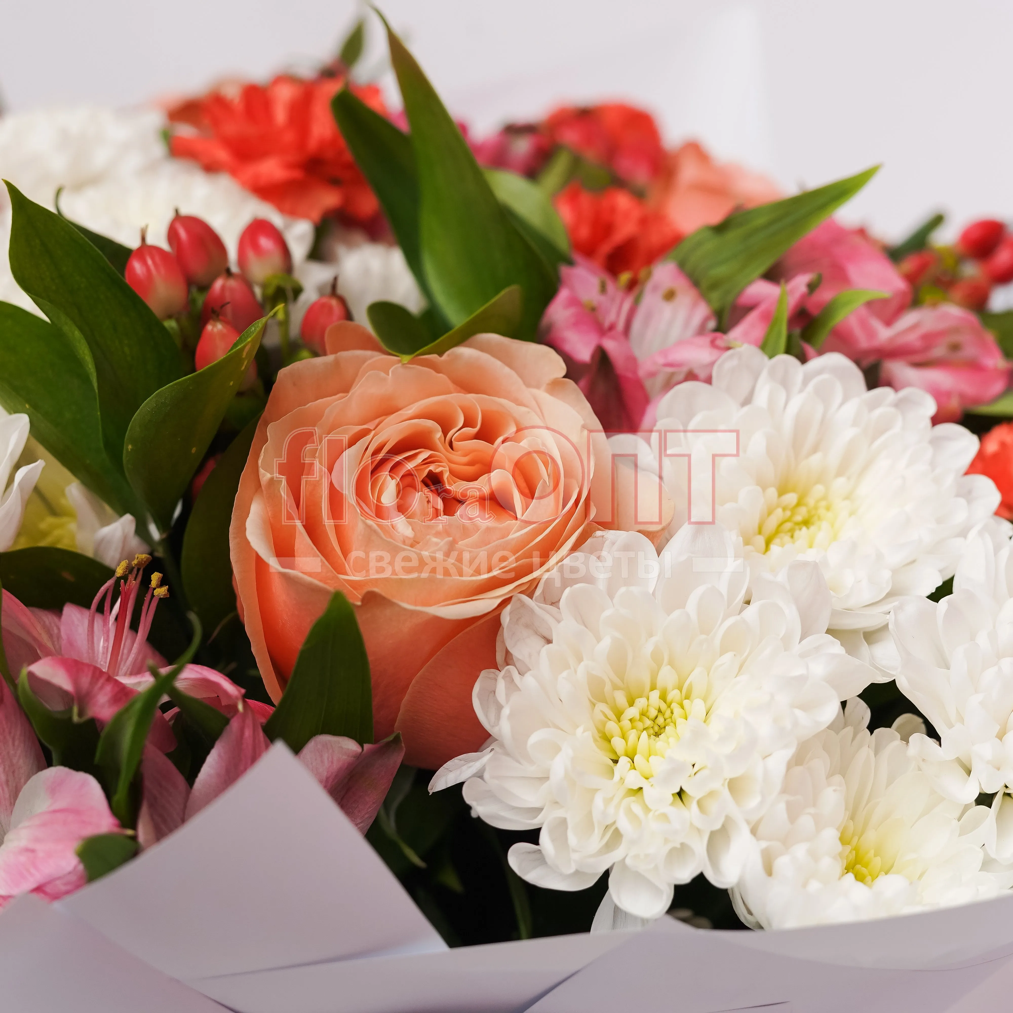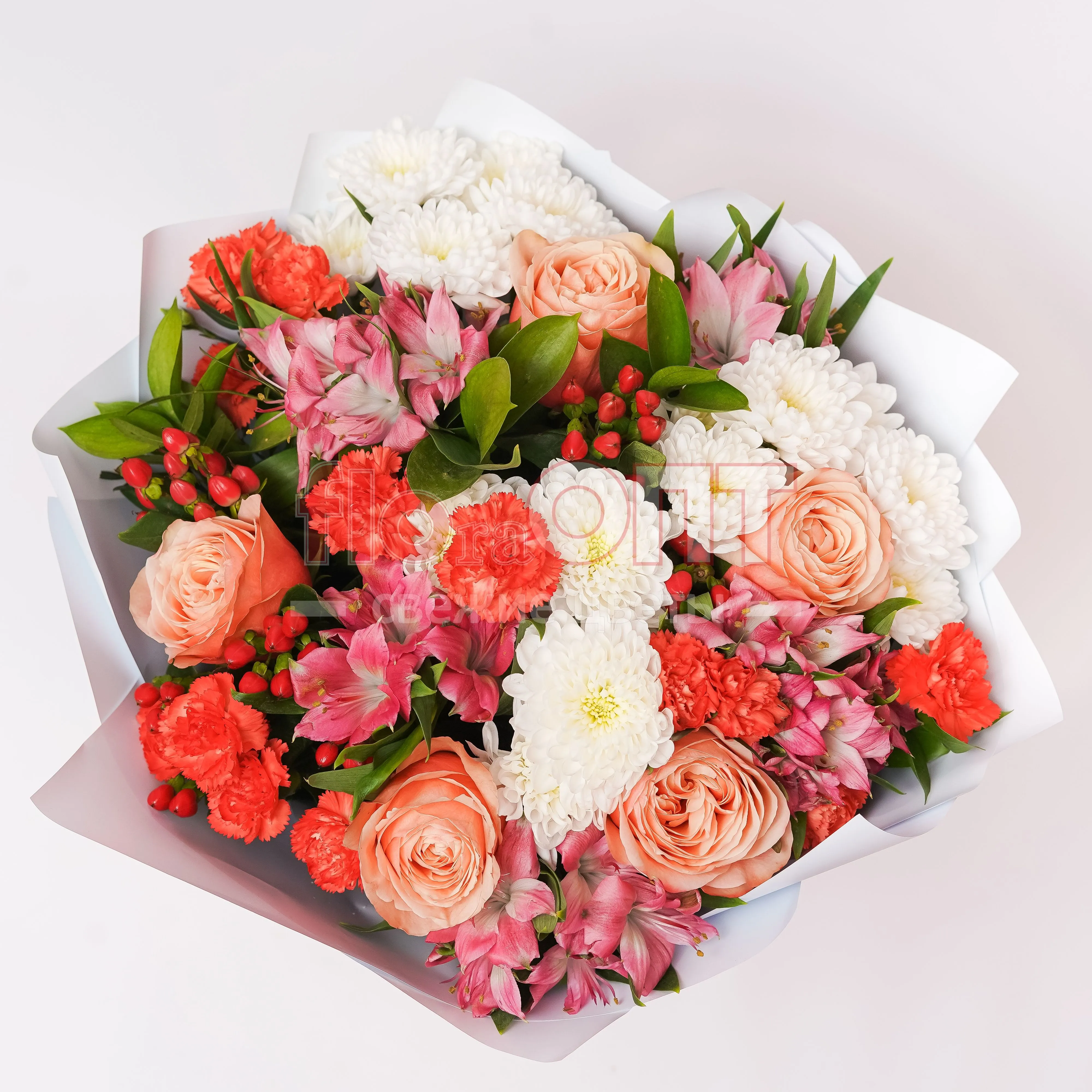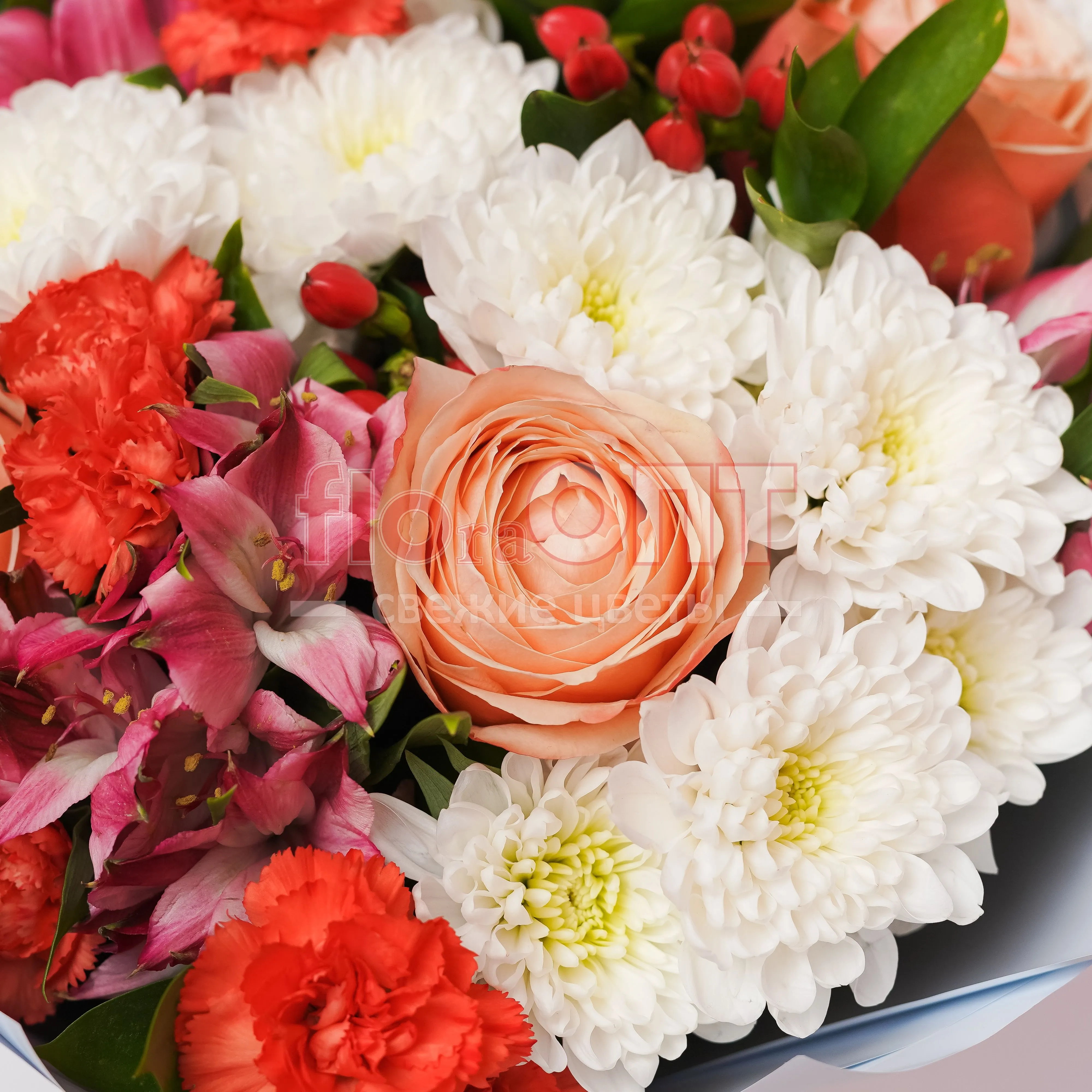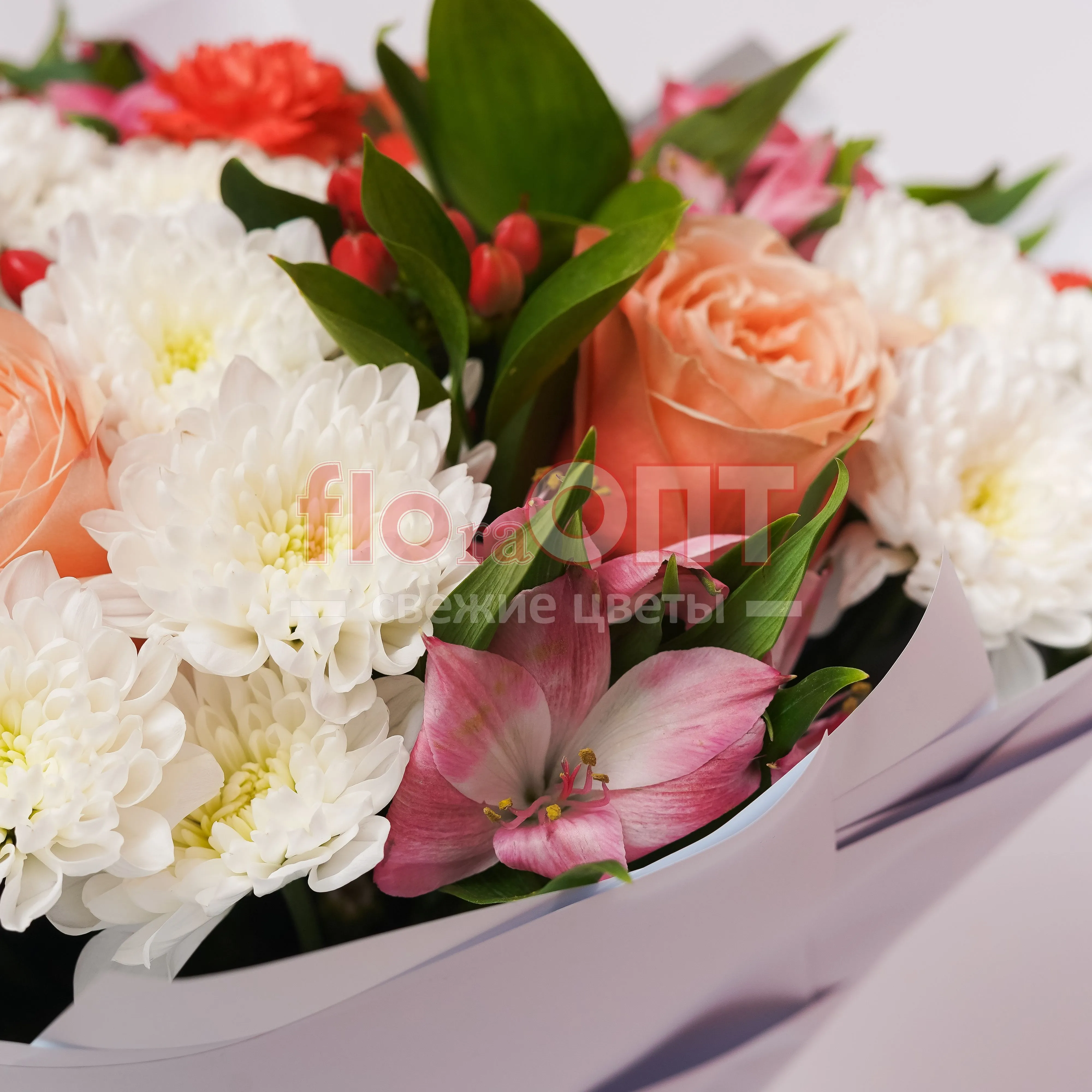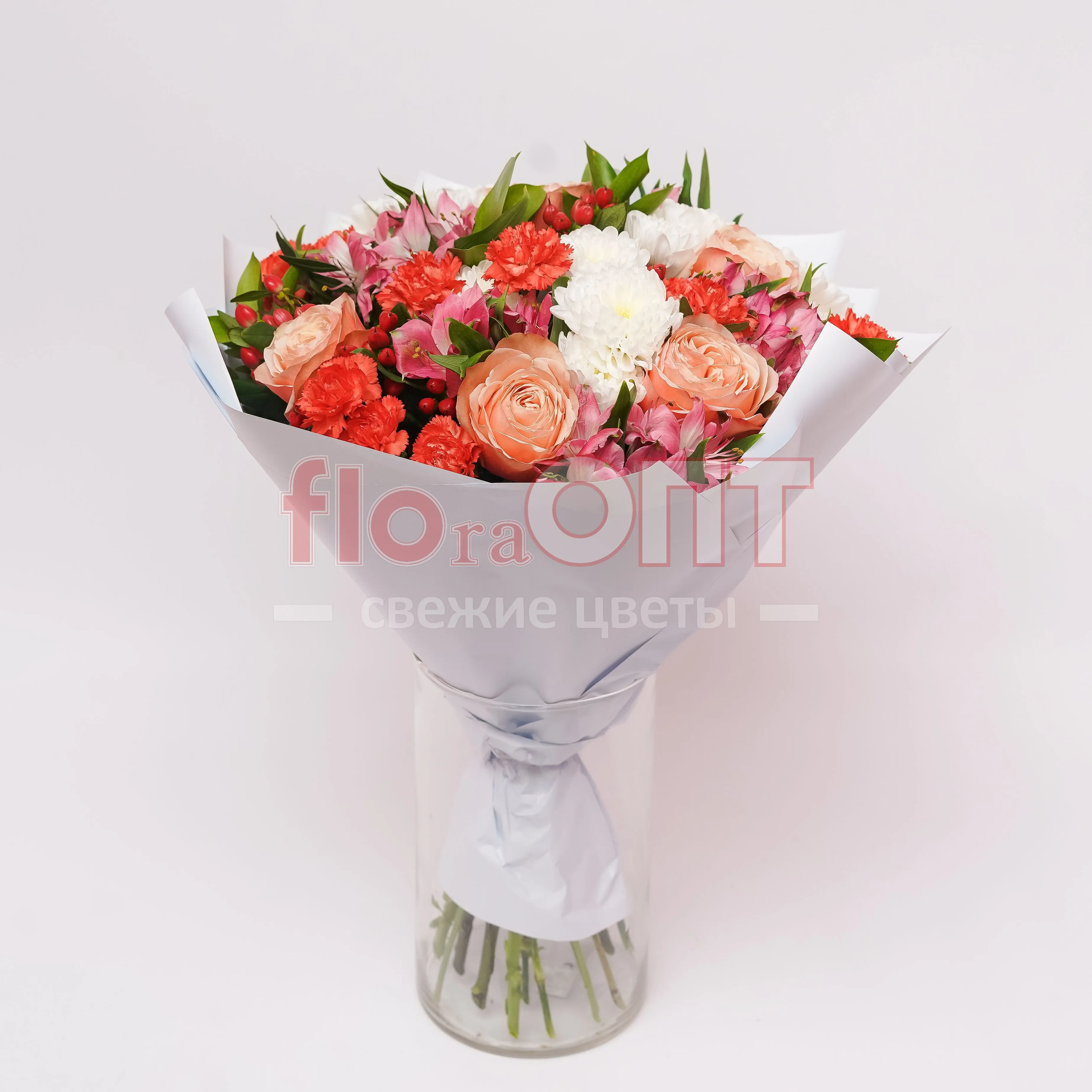 Цветы в составе Альстромерия, Гвоздика Кустовая, Пленка 250,руб, Рафия , Гиперикум, Рускус Голландия , Хризантема Кустовая, Роза Микс 50 см, Расходный материал, ✓ Все цветы в наличии