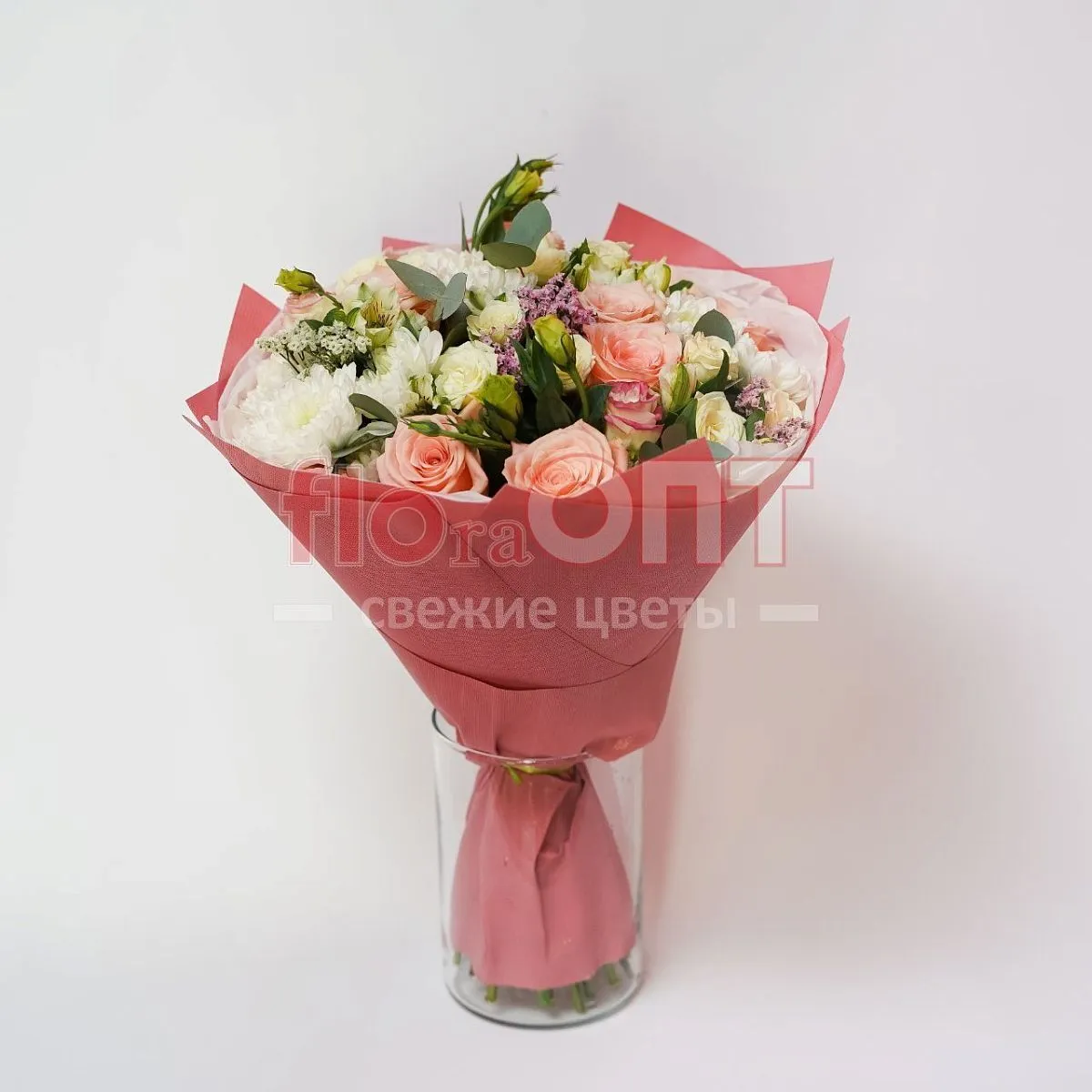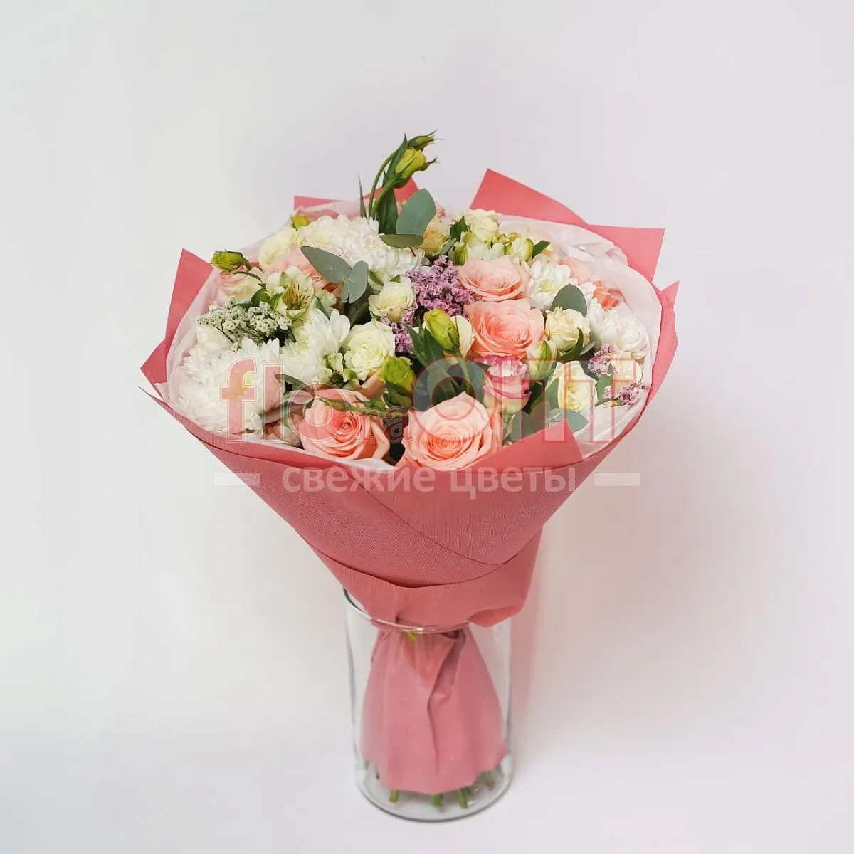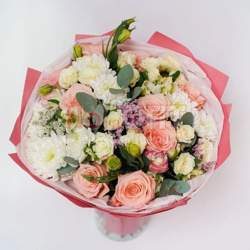 Цветы в составе Альстромерия Люкс, Рафия , Роза Россия Кустовая 50 см, Эустома, Хризантема Кустовая, Роза Микс 60 см, Бумага Тишью, Фоамиран, Расходный материал, ✓ Все цветы в наличии