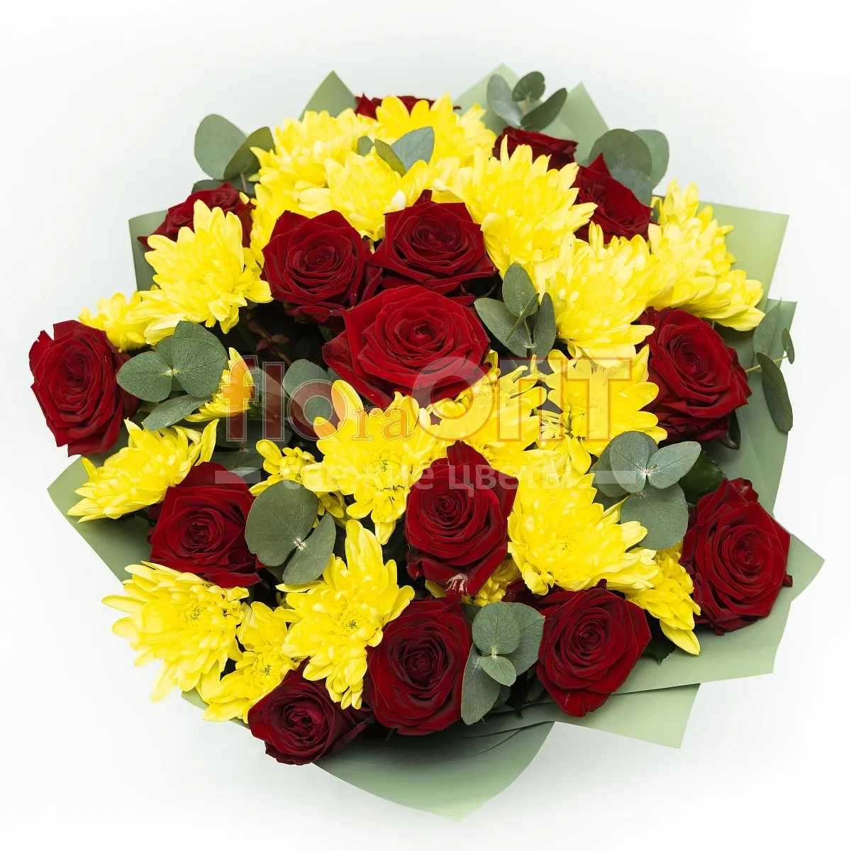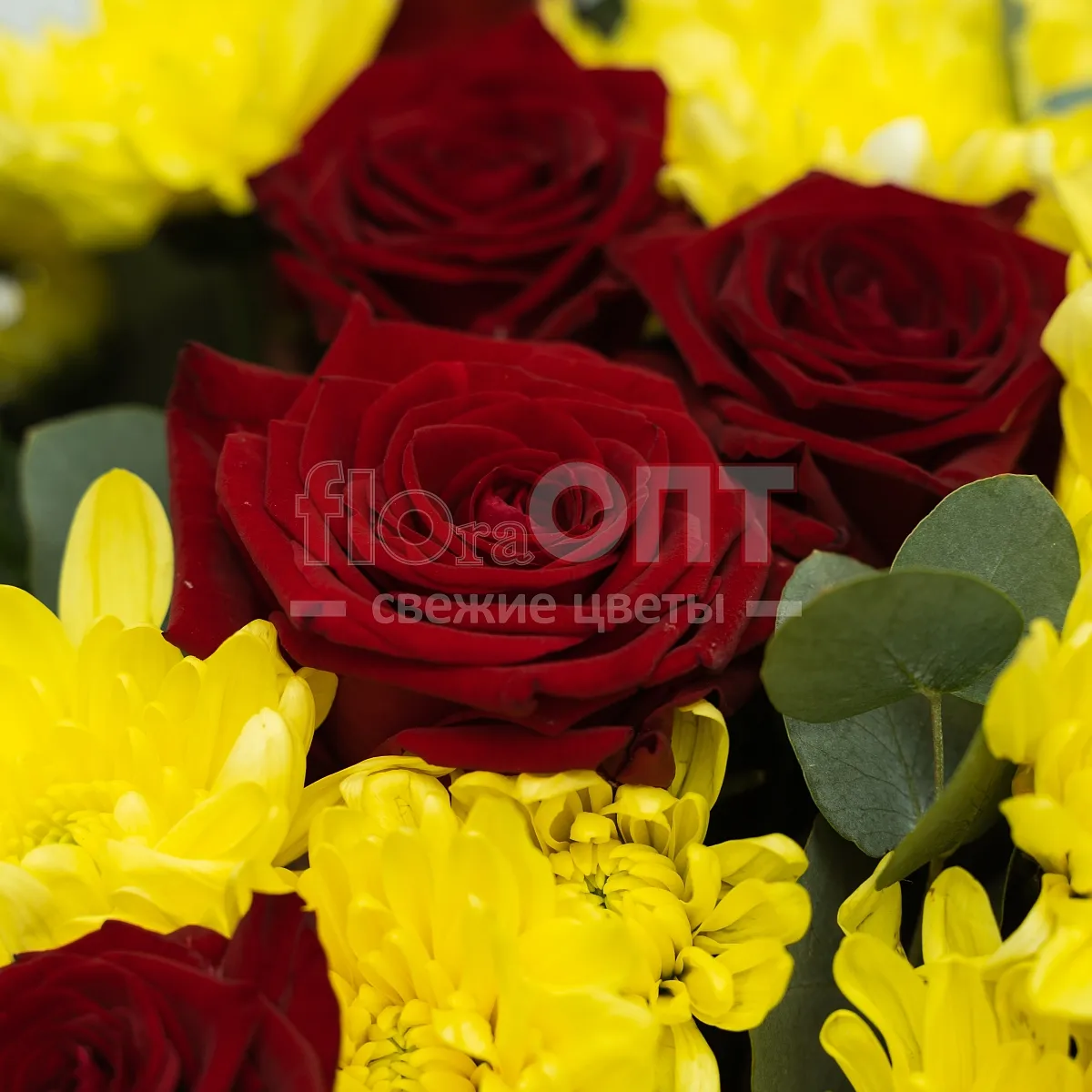 Цветы в составе Лента пластиковая 30 руб, Пленка 250,руб, Эвкалипт Де Люкс, Роза Гран При 50 см, Хризантема Кустовая , Расходный материал, ✓ Все цветы в наличии