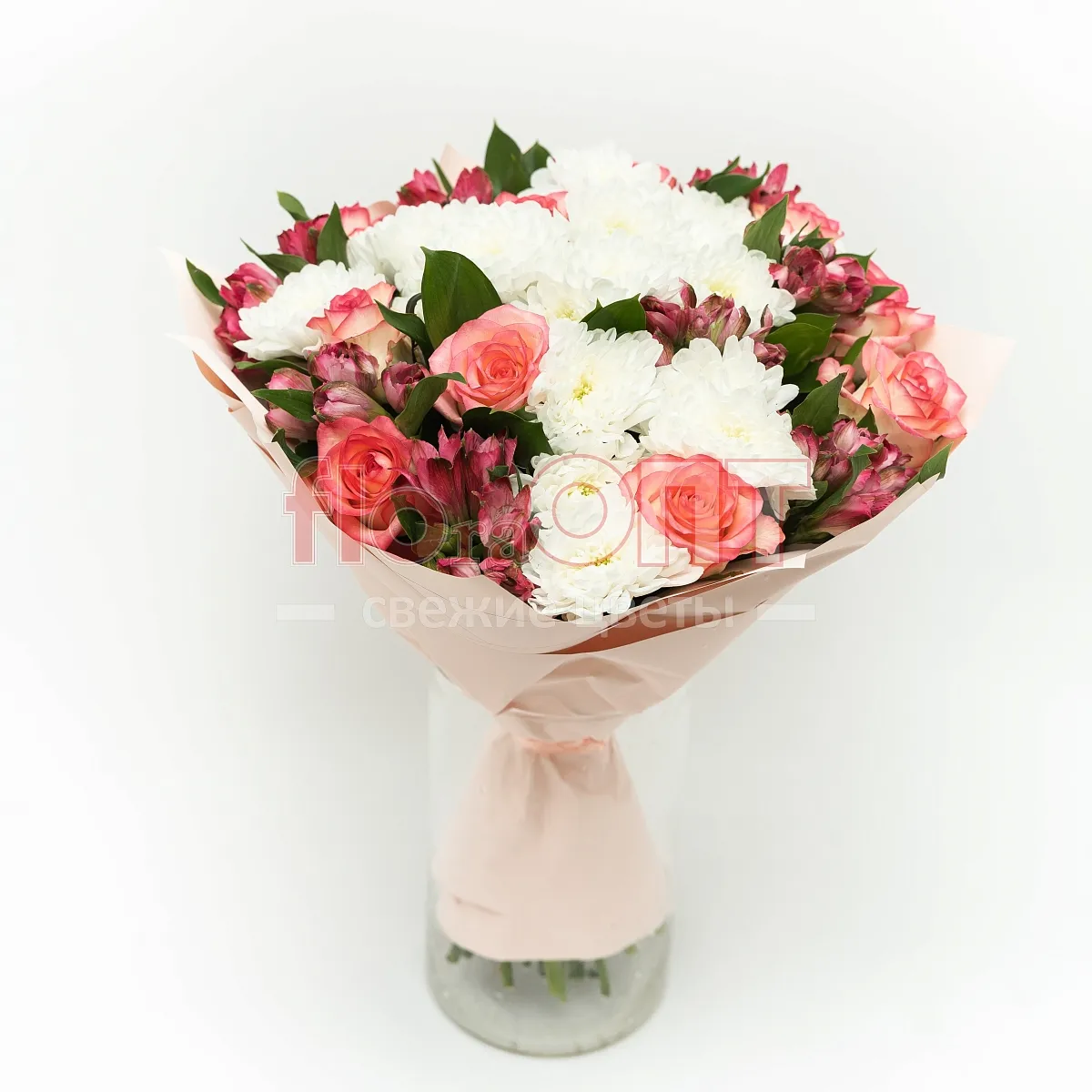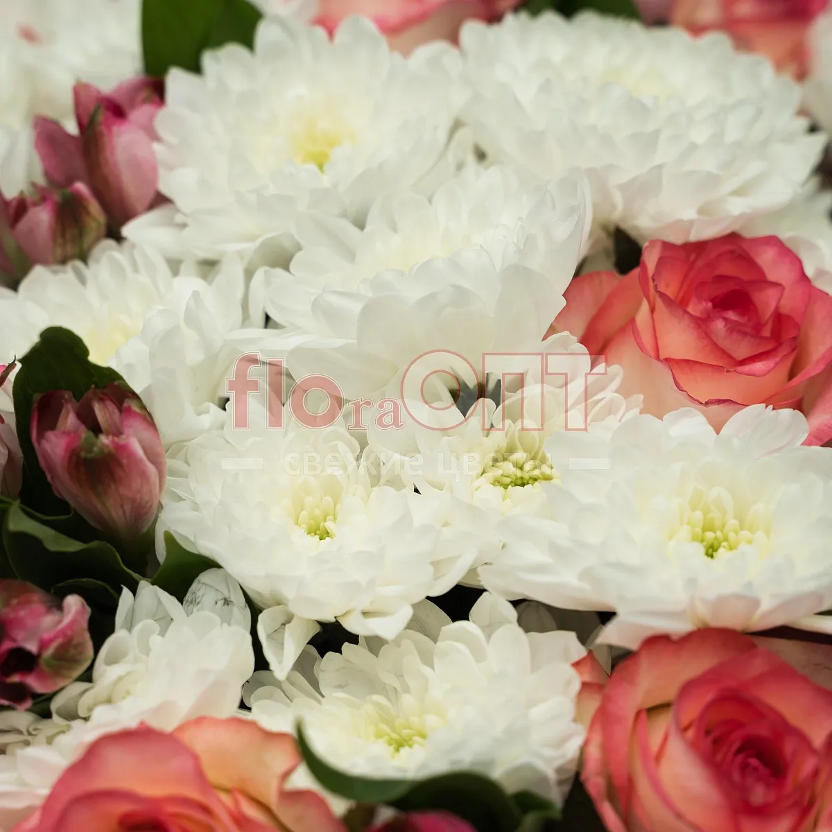 Цветы в составе Альстромерия, Лента пластиковая 30 руб, Пленка 250,руб, Роза Россия 50 см, Хризантема Кустовая , Расходный материал, ✓ Все цветы в наличии