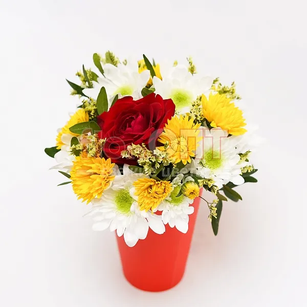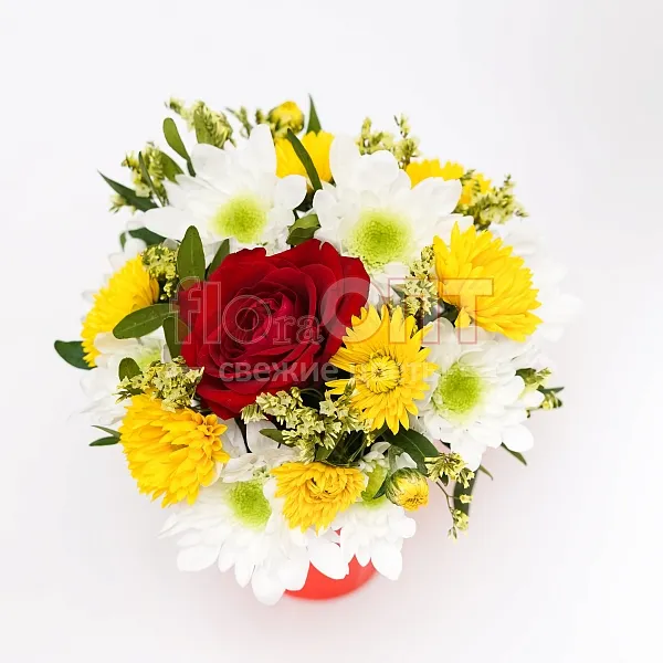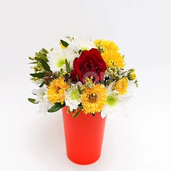 Цветочный стаканчик № 133 с хризантемой и красной розой