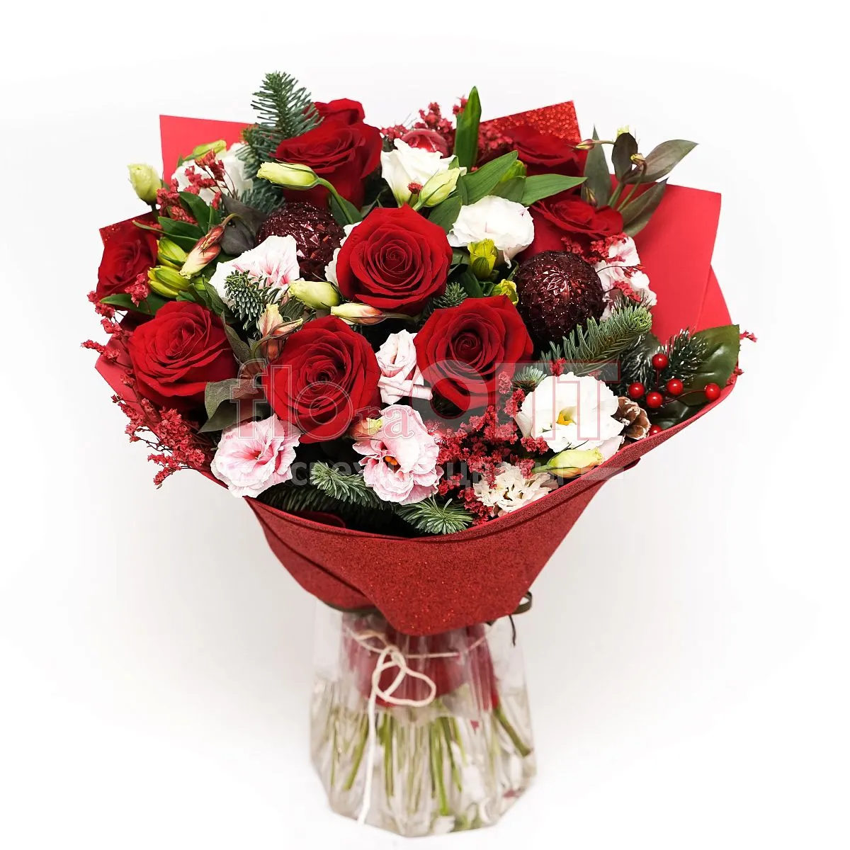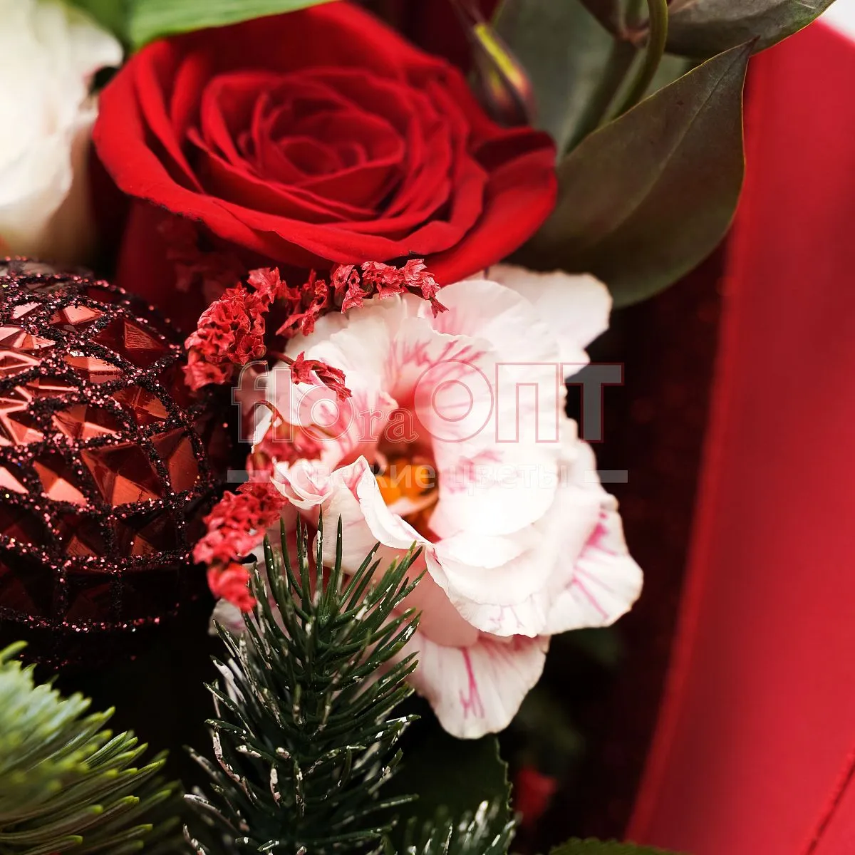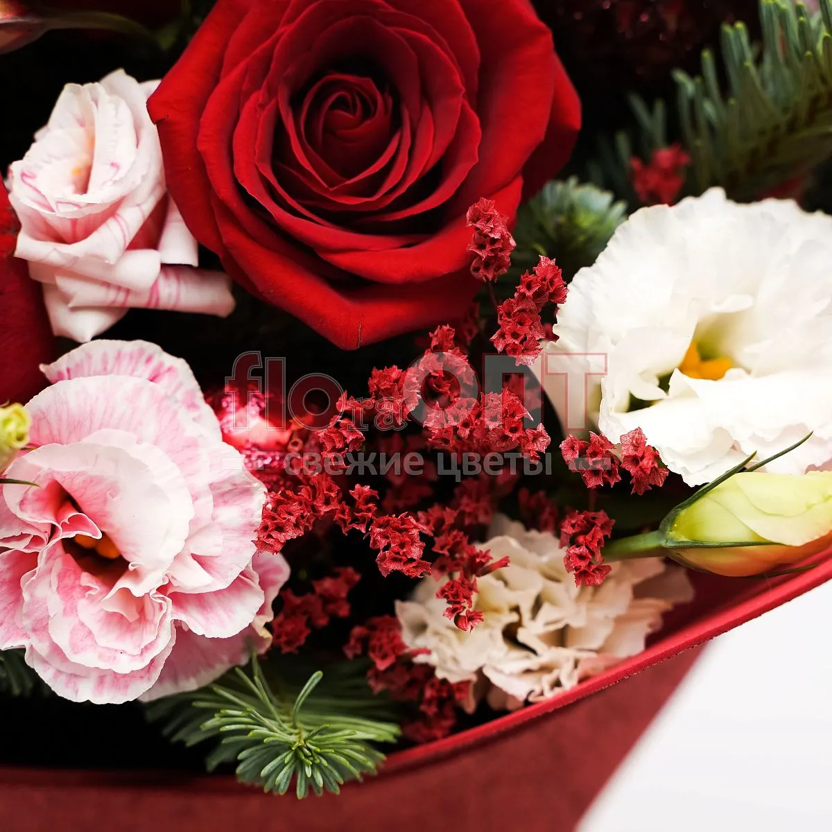 Цветы в составе Лапка Ели , Лента текстиль 80 руб, Лимониум Натуральный (Роял), Роза Форевер 50 см, Эустома, Декор 150 руб, Фоамиран, ✓ Все цветы в наличии