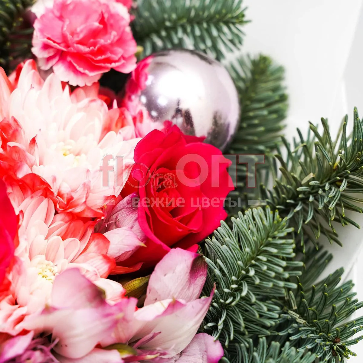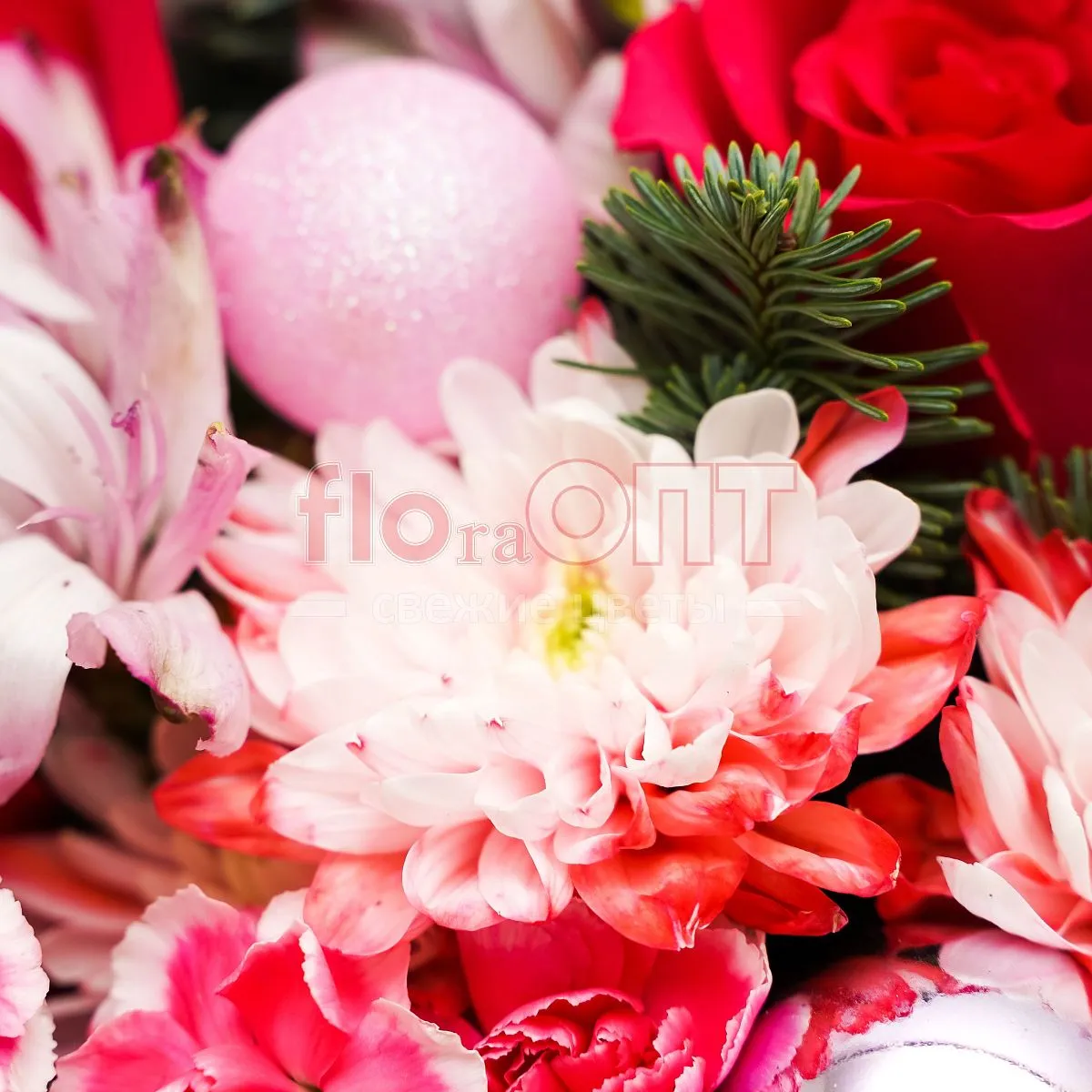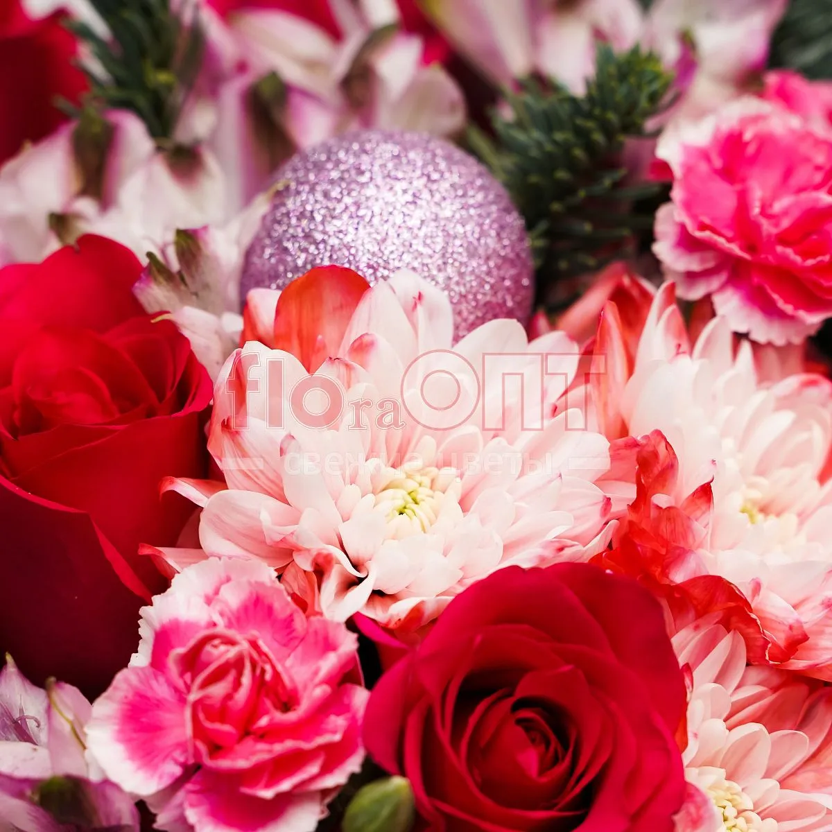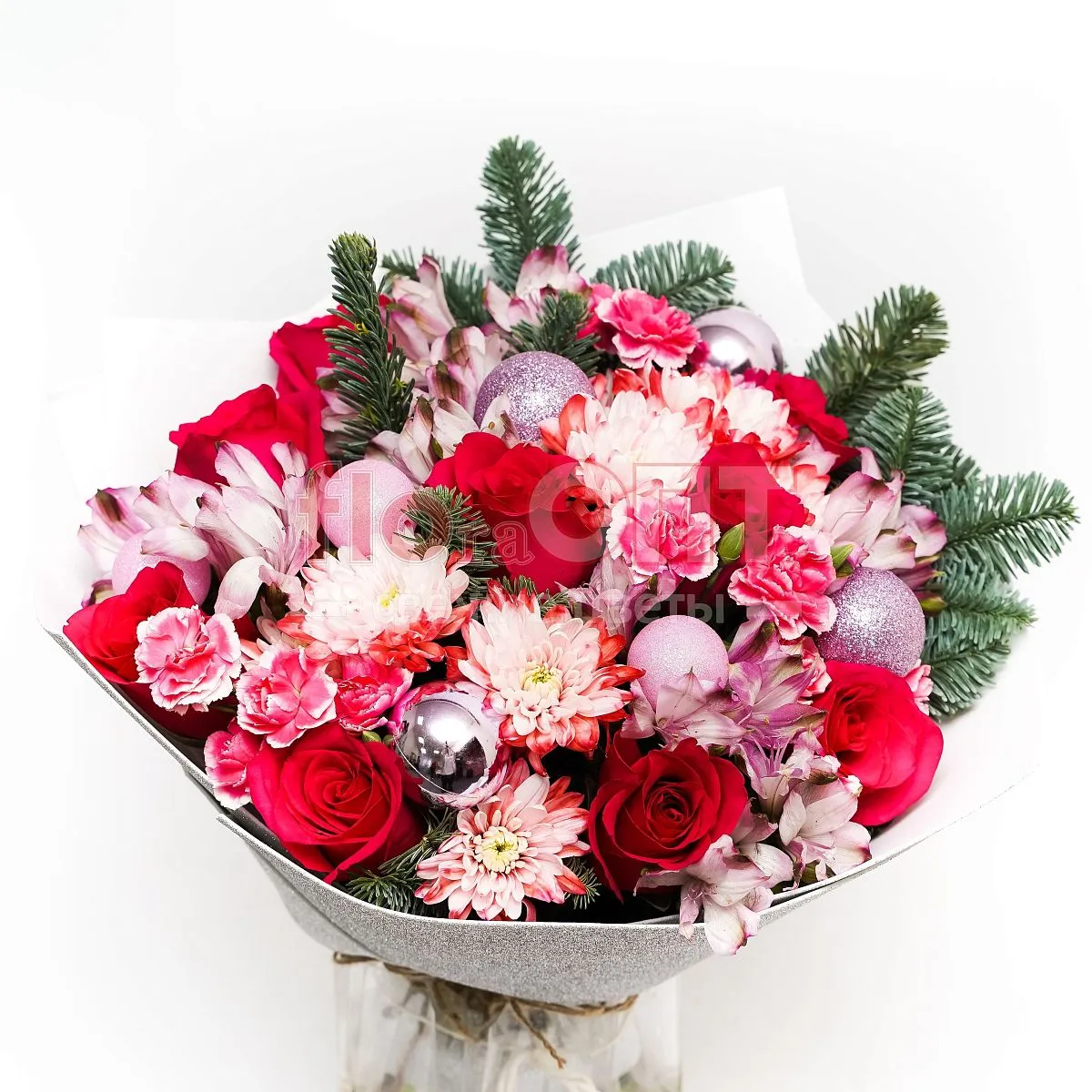 Цветы в составе Альстромерия, Гвоздика Кустовая, Лапка Ели , Рафия , Декор 100 руб, Хризантема Кустовая Крашенная, Роза Микс 50 см, Фоамиран, ✓ Все цветы в наличии