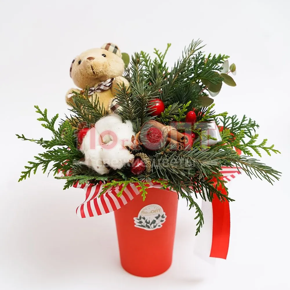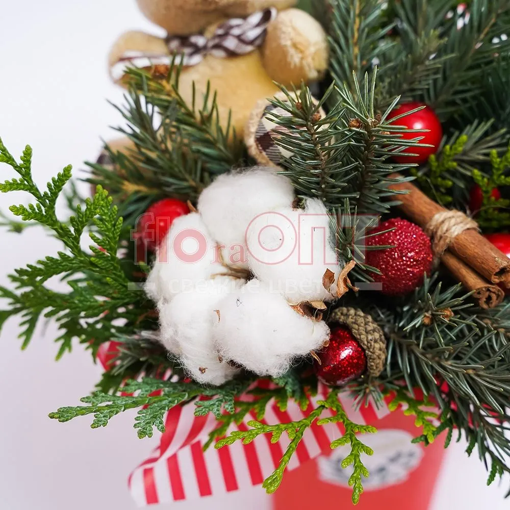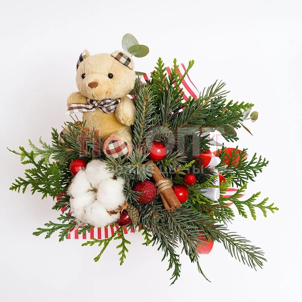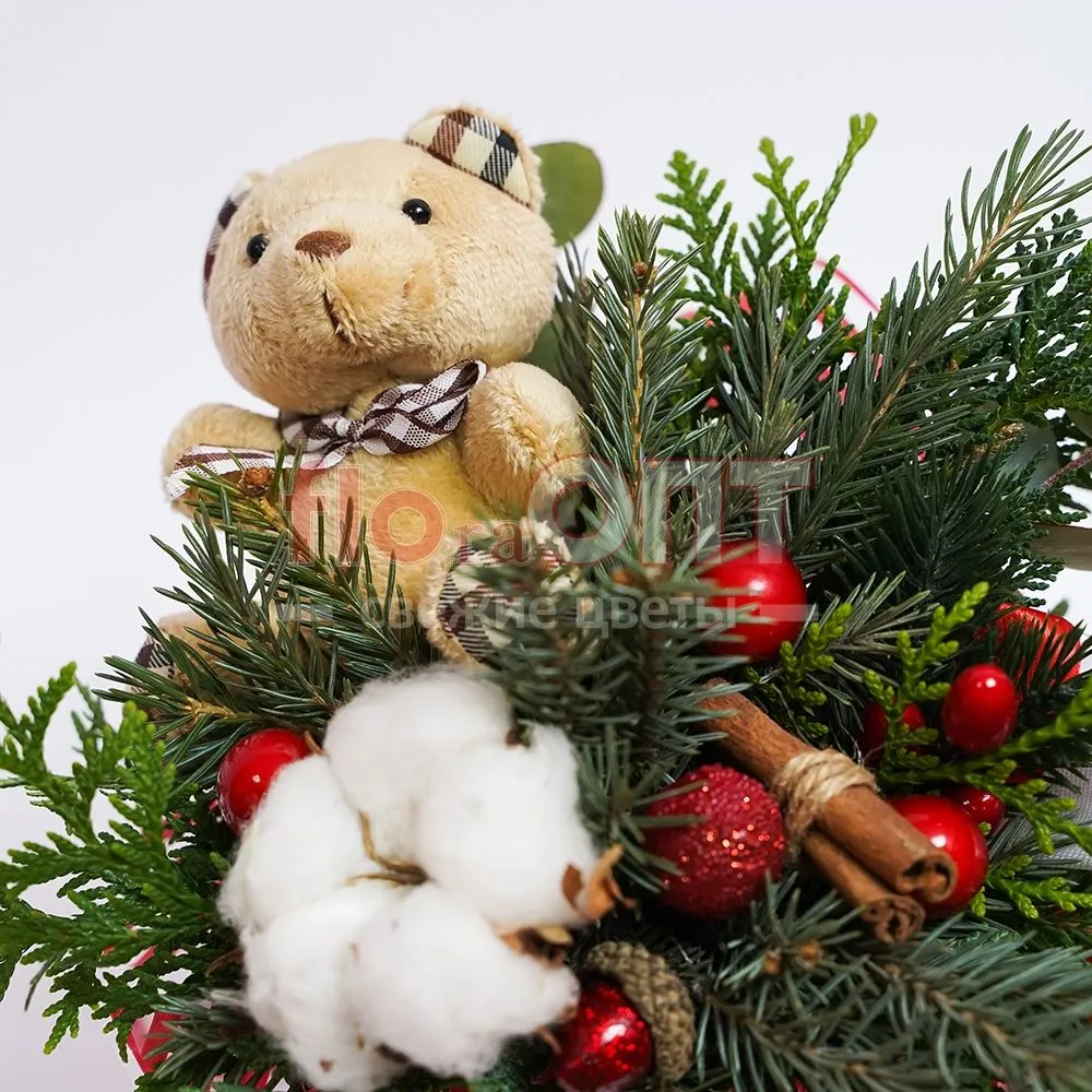 Цветы в составе Лапка Ели , Лента текстиль 80 руб, Оазис , Пленка 250,руб, Хлопок ( 60 ), Эвкалипт Де Люкс, Декор 20 руб, Декор 30 руб, Декор 50 руб, Декор 70 руб, Мягкая игрушка 150 руб, Туя Зеленая, Расходный материал, ✓ Все цветы в наличии