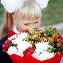 «Первый раз — в первый класс! Понесли учителю шикарный букет.»