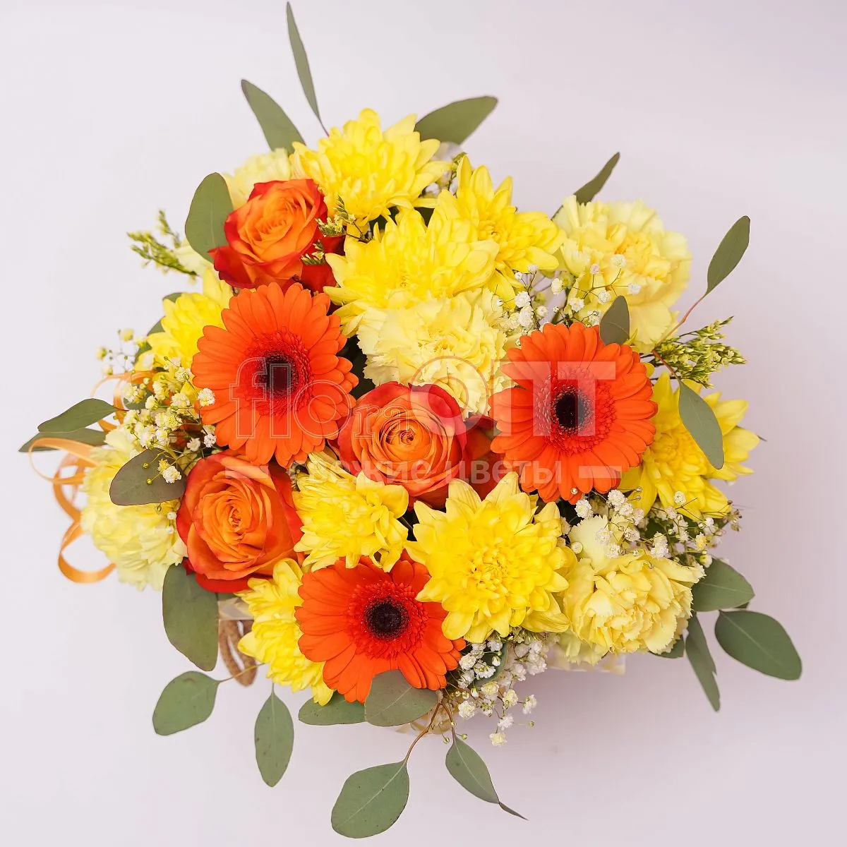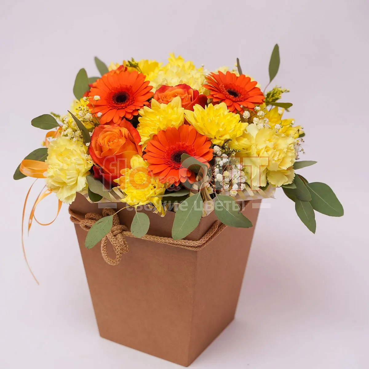 Цветы в составе Гвоздика Одиночная, Гербера Мини, Гипсофила, Лимониум Натуральный (Роял), Оазис , Эвкалипт Де Люкс, Хризантема Кустовая, Коробка 200 руб, Роза Микс 50 см, Бумага Тишью, Расходный материал, ✓ Все цветы в наличии