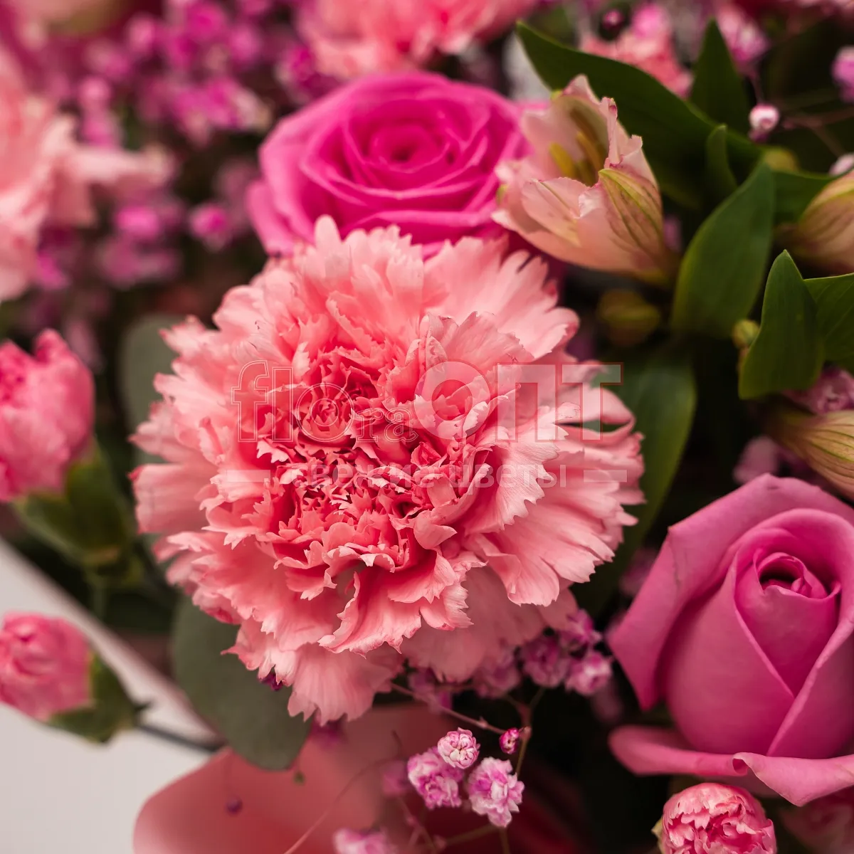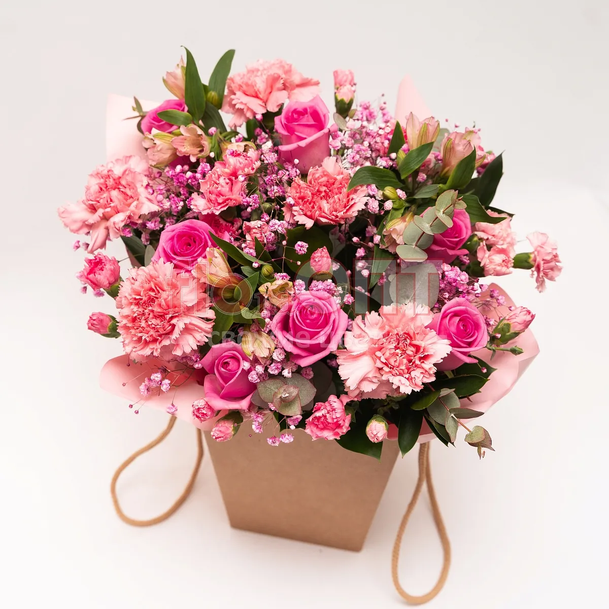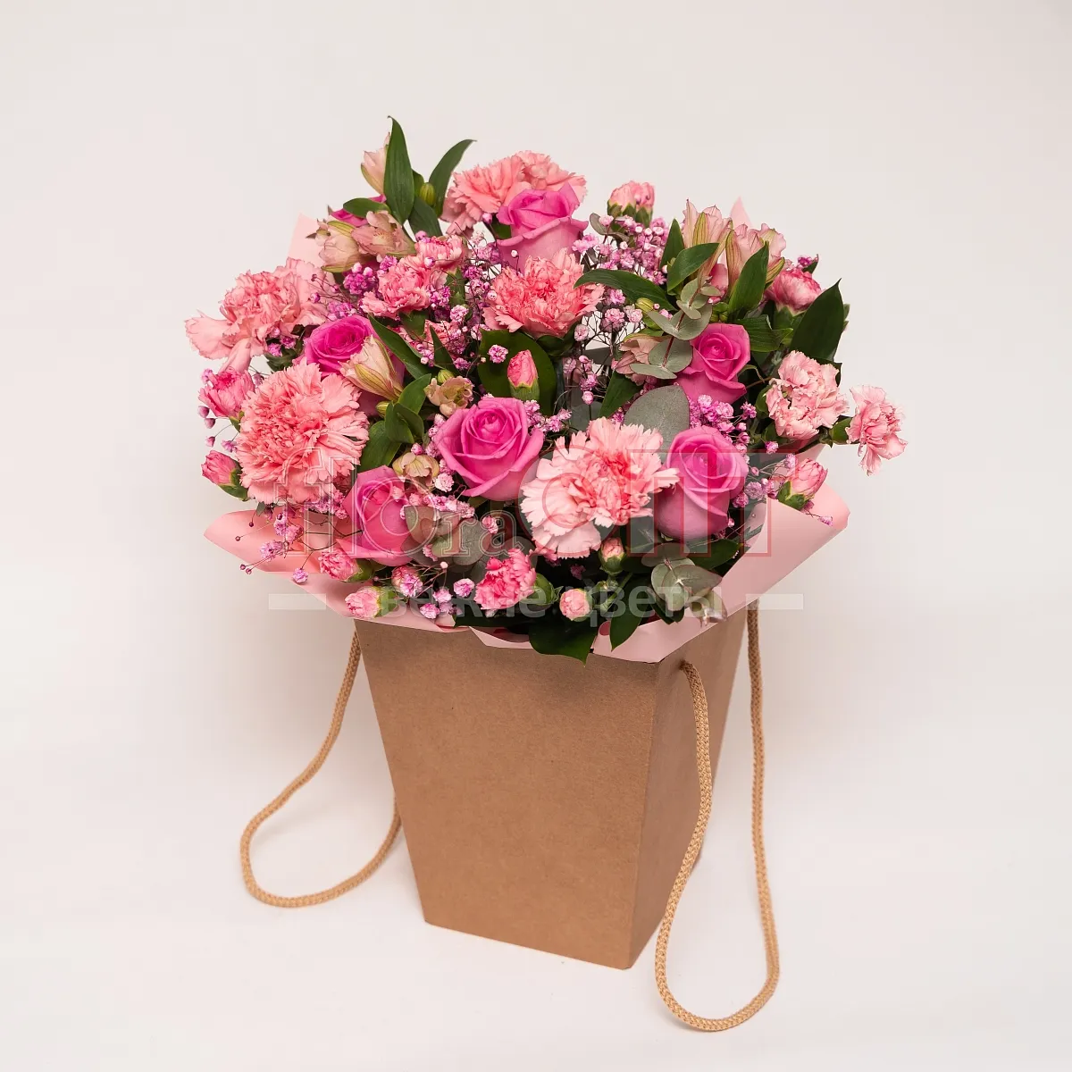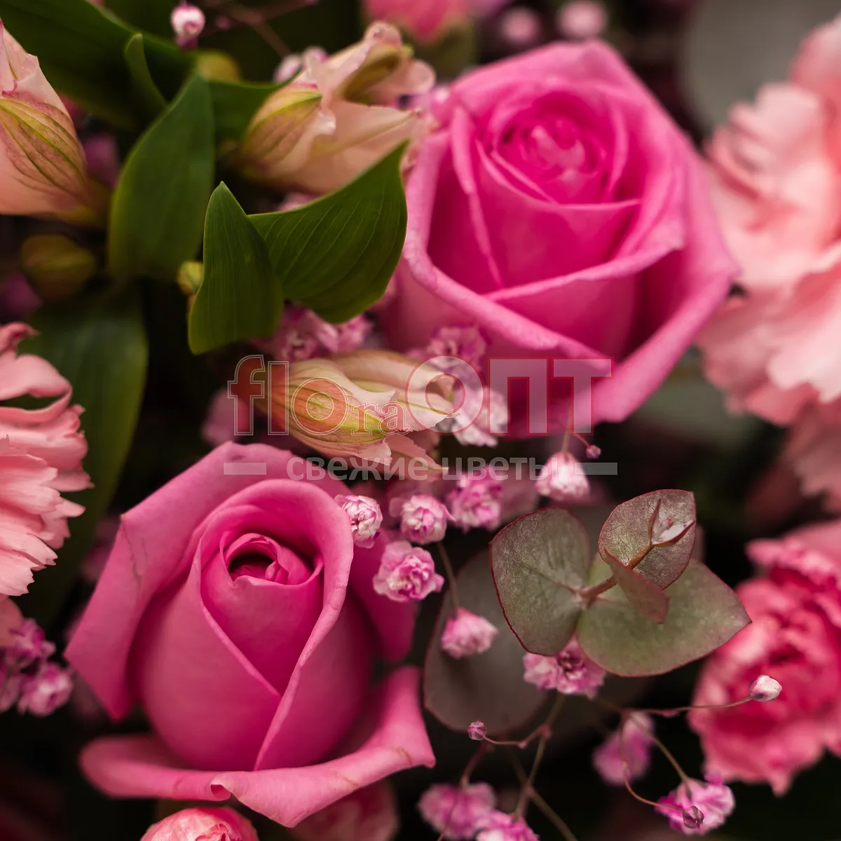 Цветы в составе Альстромерия, Гвоздика Кустовая, Гвоздика Одиночная, Оазис , Пленка 120 руб, Эвкалипт Де Люкс, Рускус Голландия , Коробка 200 руб, Гипсофила Крашеная, Роза Россия 50 см, Расходный материал, ✓ Все цветы в наличии